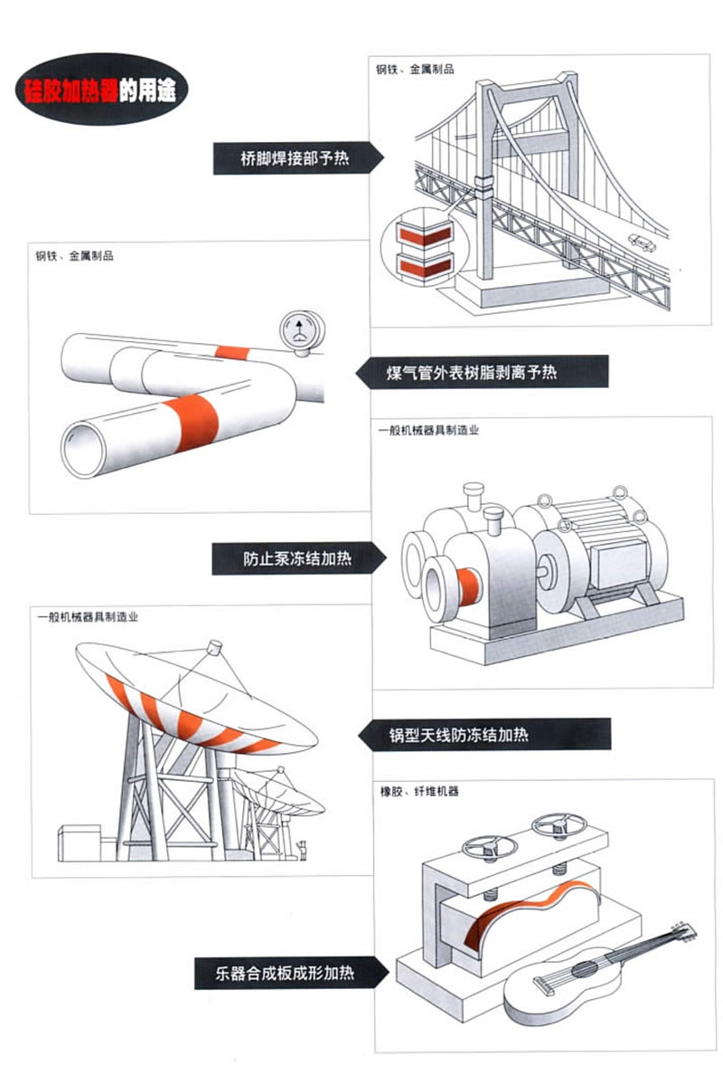 硅胶加热器可使用在潮湿、无爆炸性气体的场合、工业设备管道、罐桶等的拌热和保温,使用时可直接缠在被加热物体的表面。